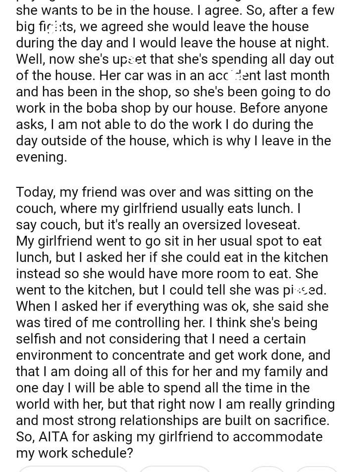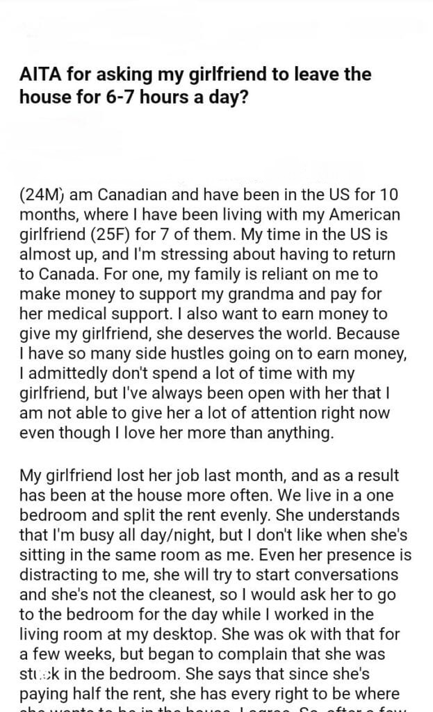 AITA for asking my girlfriend to leave the house for 6-7 hours a day?
