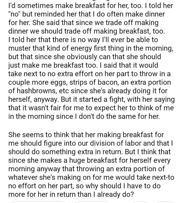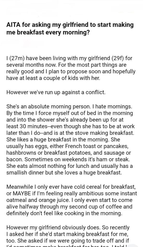 AITA for asking my girlfriend to start making me breakfast every morning?