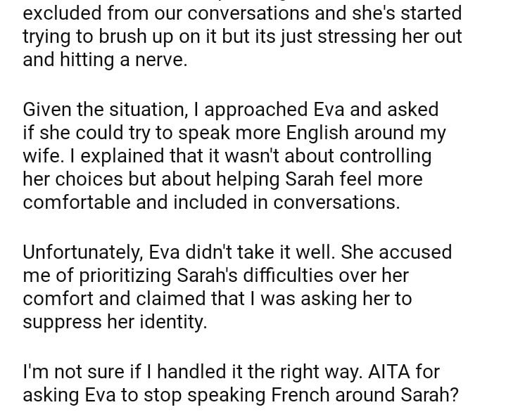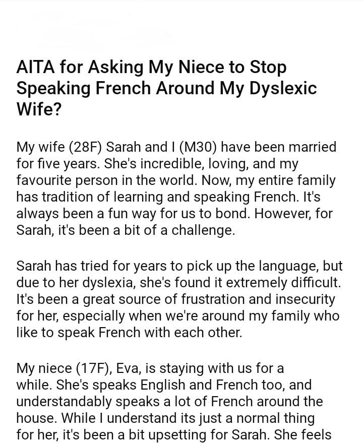 AITA for Asking My Niece to Stop Speaking French Around My Dyslexic Wife?