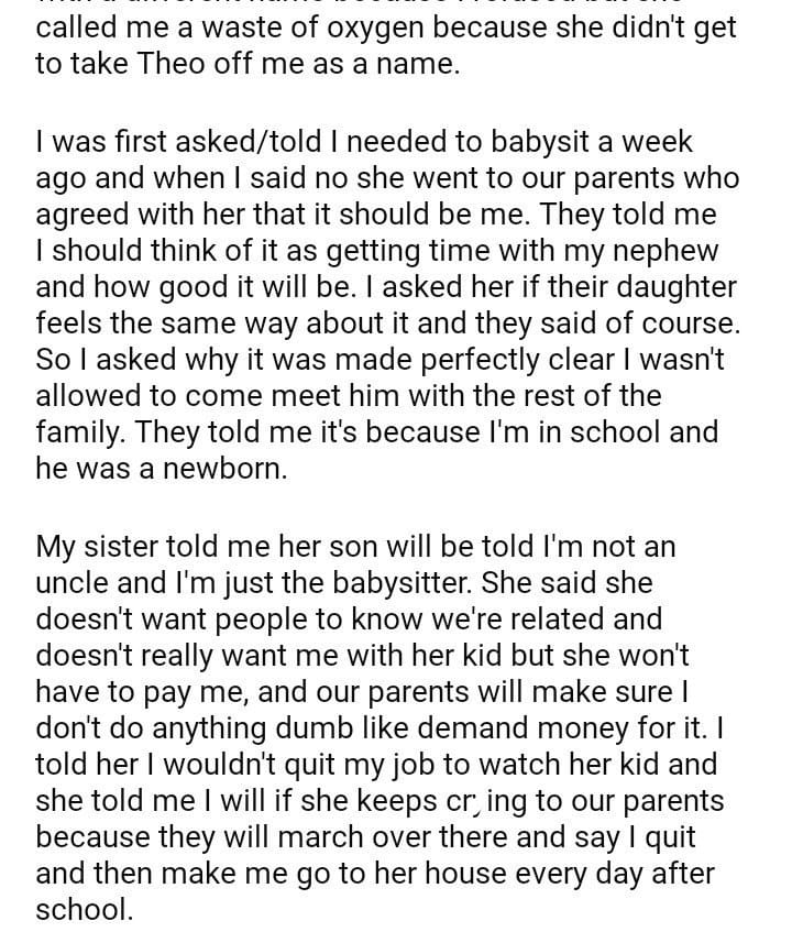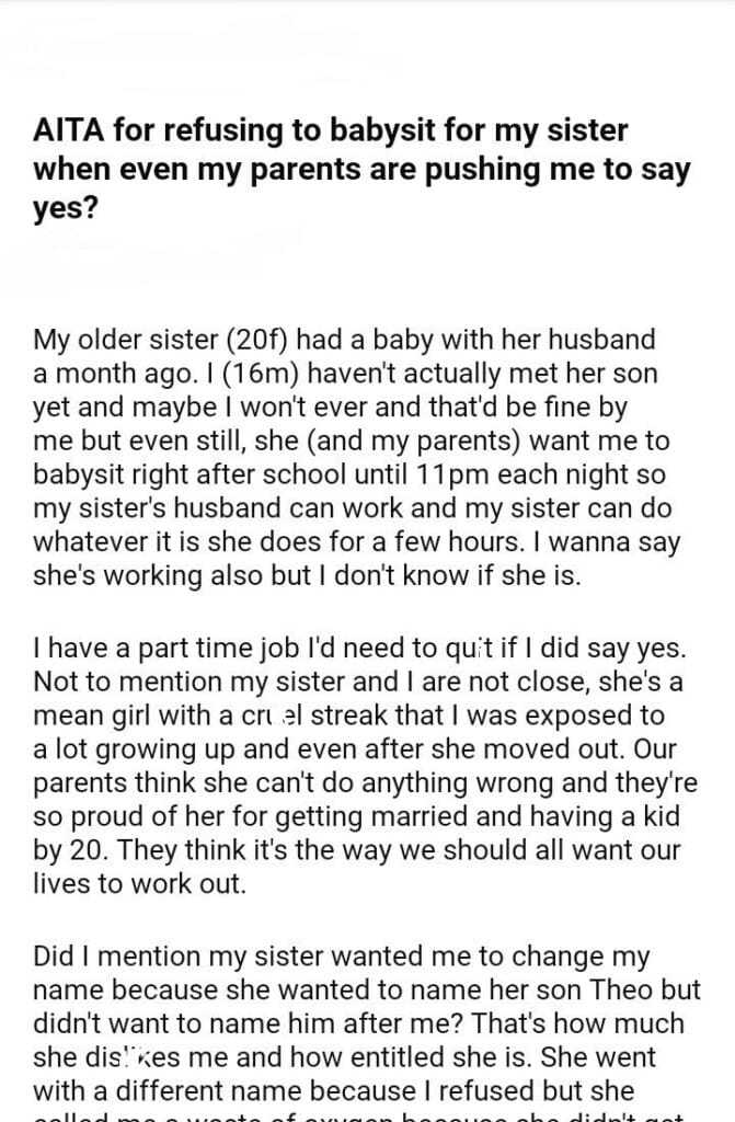 AITA for babysit for my sister when my parent