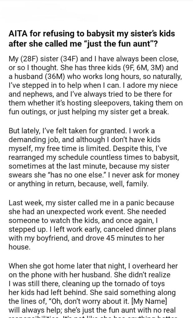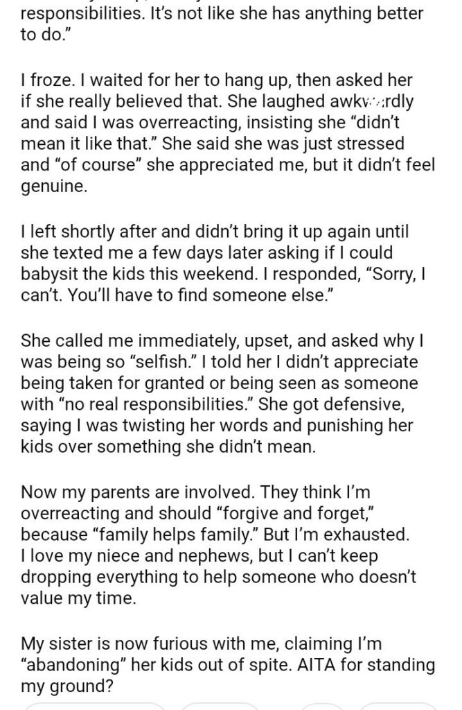 AITA for babysit my sister’s kids after she called me