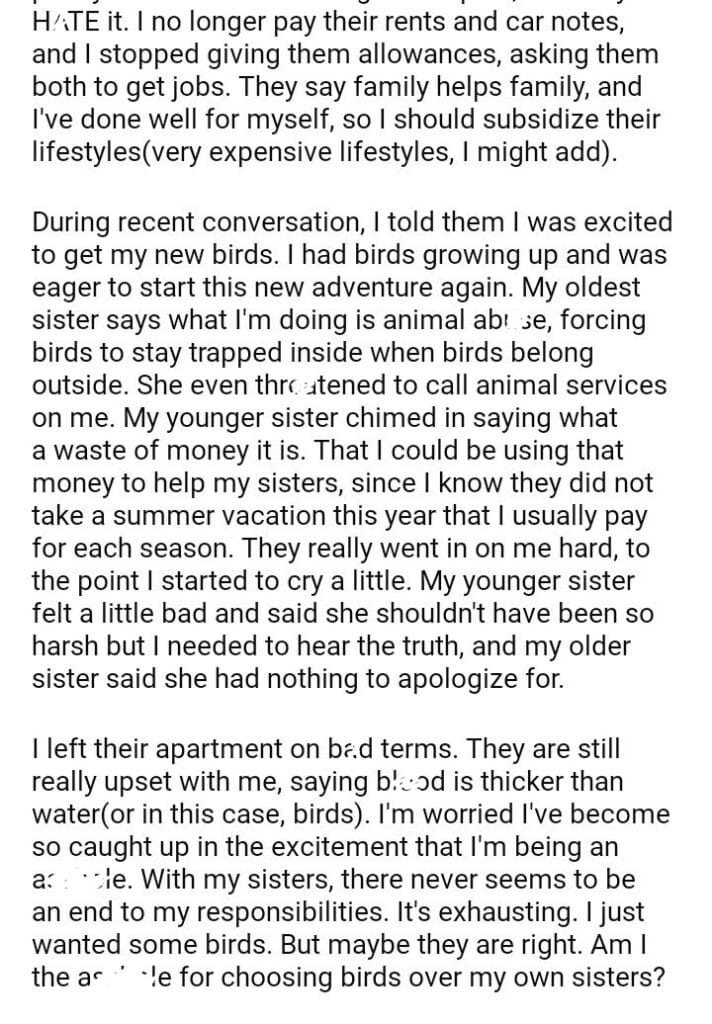 AITA for birds instead of helping my sisters?