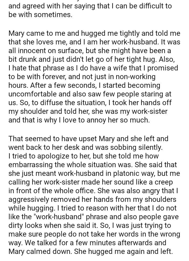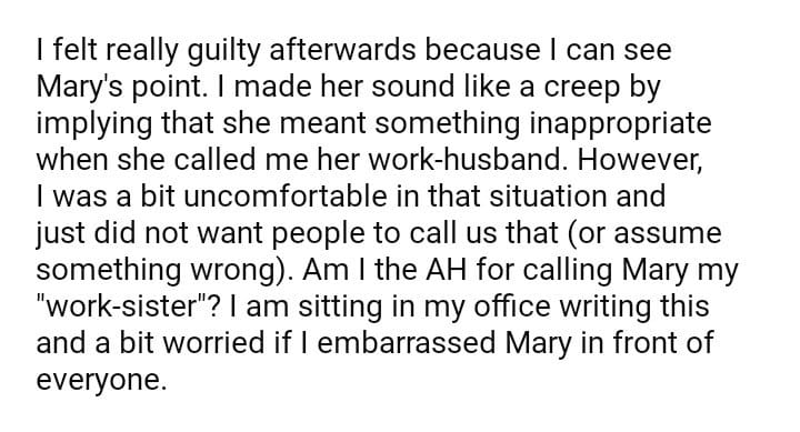 AITA for calling my coworker work-sister after she called me work-husband in front of everyone?