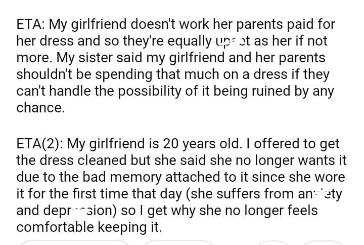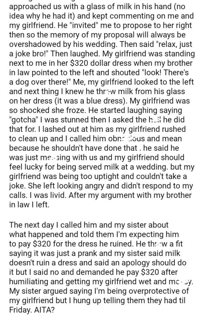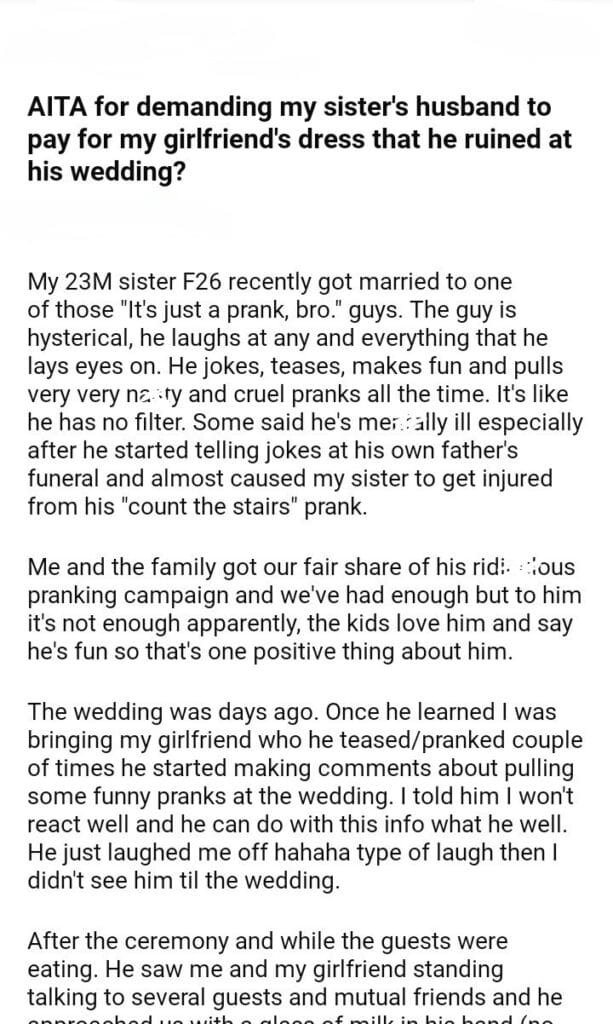 AITA for demanding my sister’s husband to pay for my girlfriend’s dress
