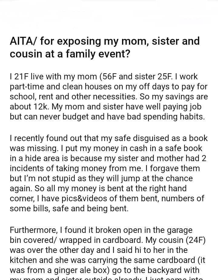 AITA for exposing my mom, sister and cousin at a family event?