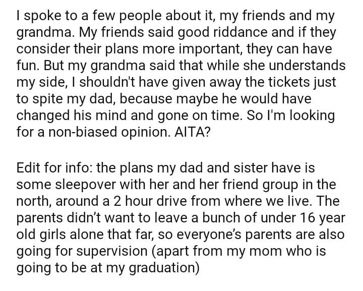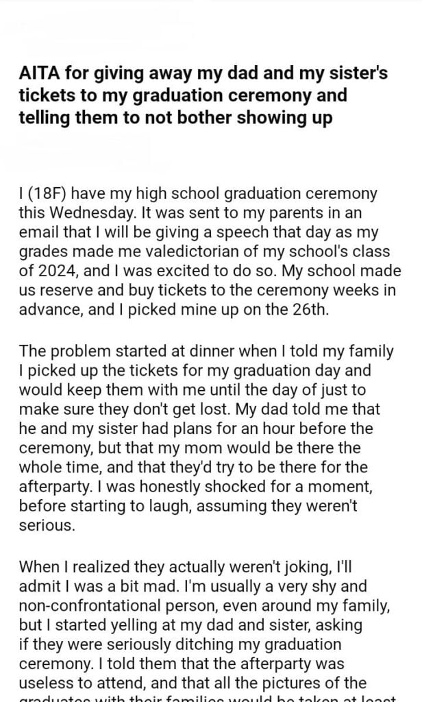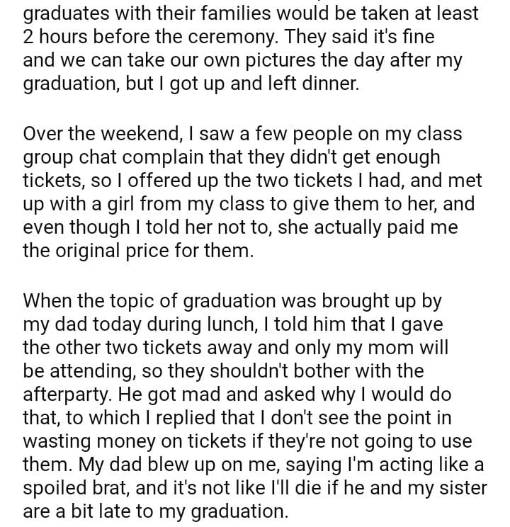 AITA for giving away my dad and my sister’s tickets to my graduation ceremony