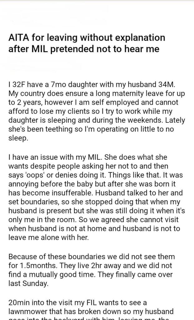 AITA for leaving without explanation after MIL pretended not to hear me