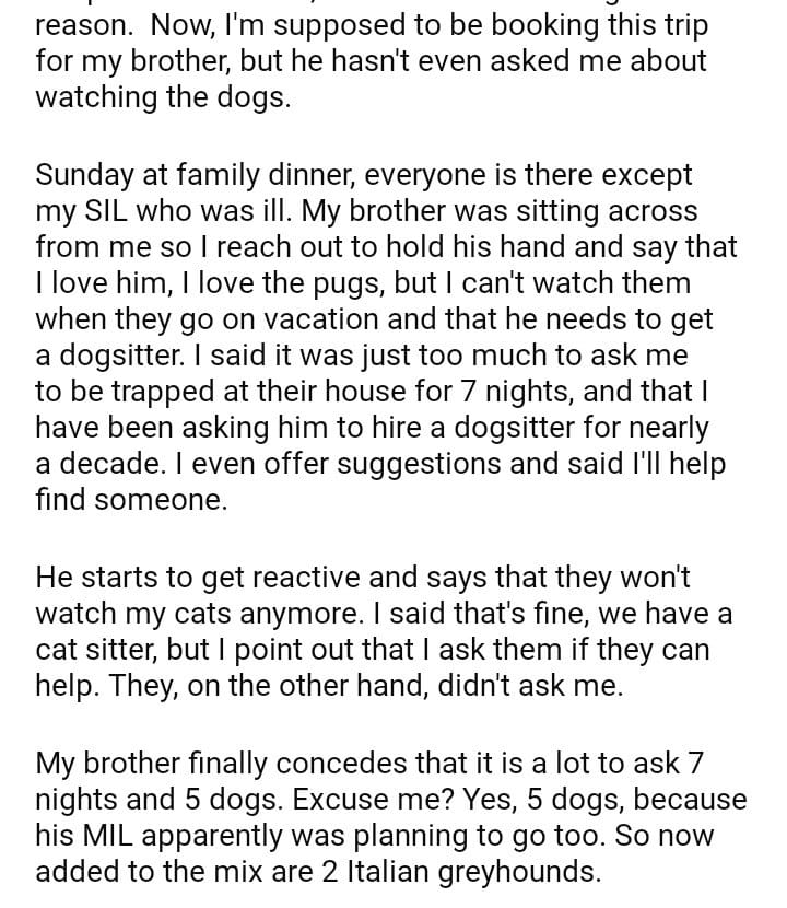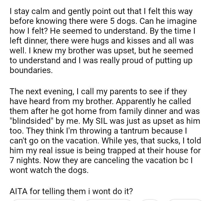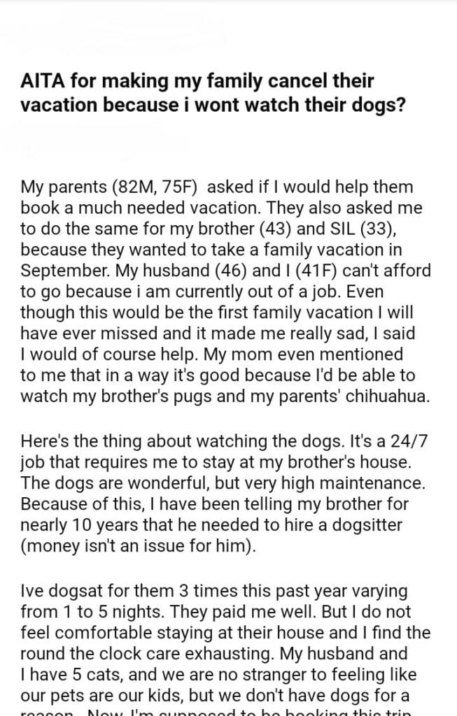 AITA for making my family cancel their vacation because i wont watch their dogs?
