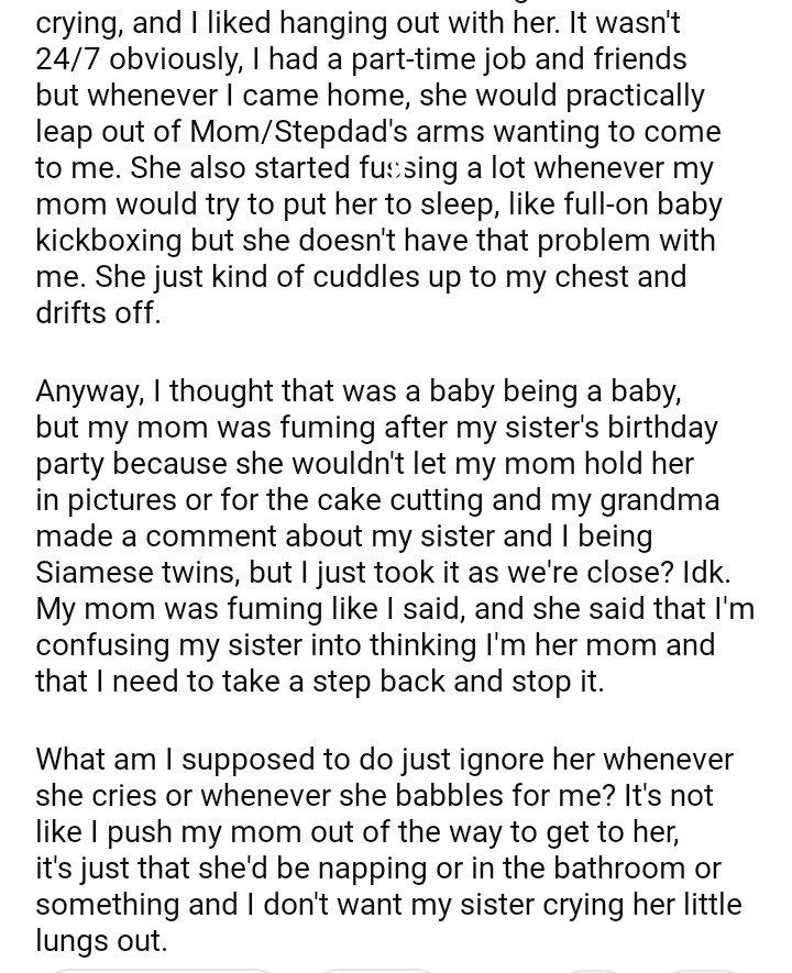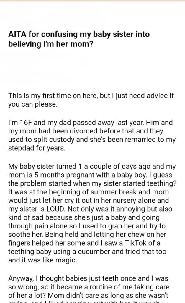 AITA for my baby sister into believing I’m her mom?