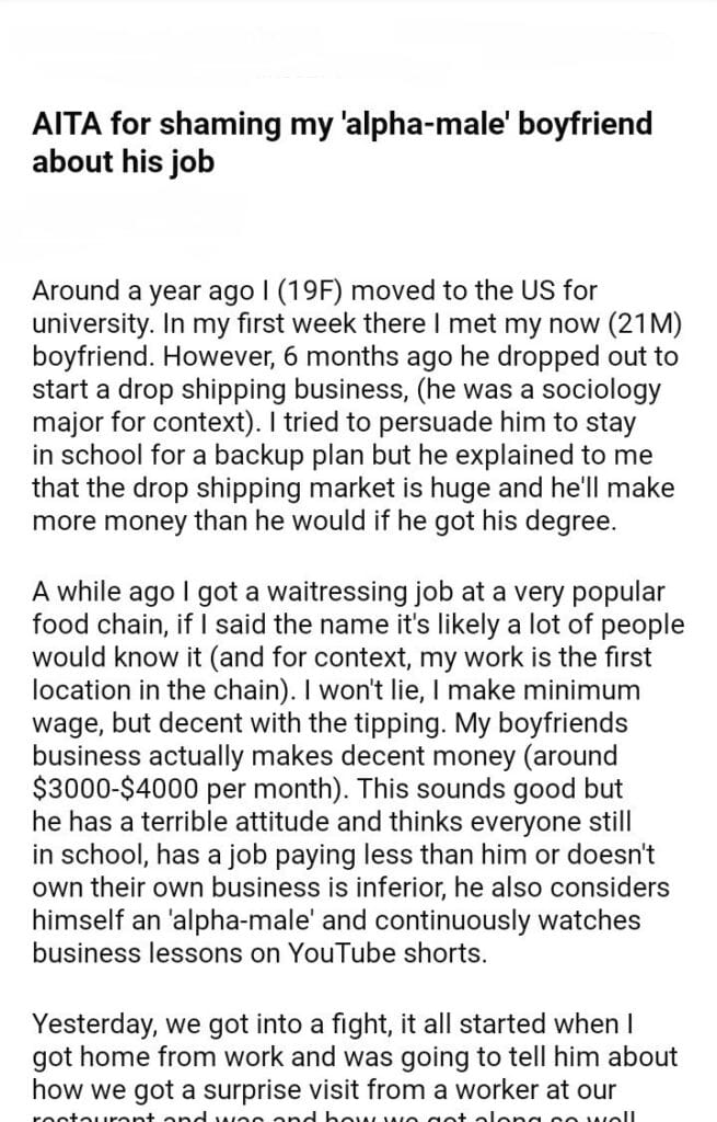 AITA for my boyfriend about his job