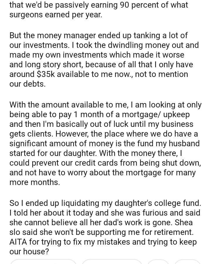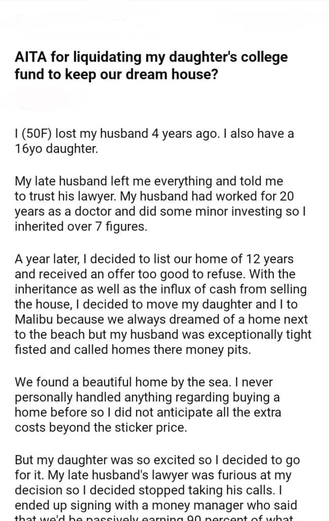 AITA for my daughter’s college fund to keep our dream house?