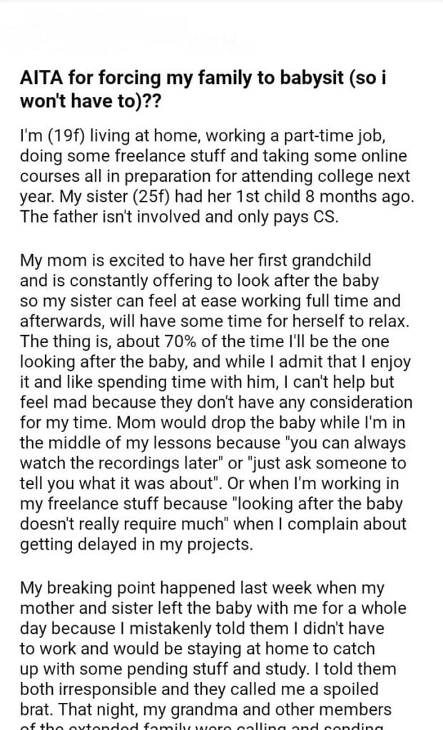 AITA for my family to babysit