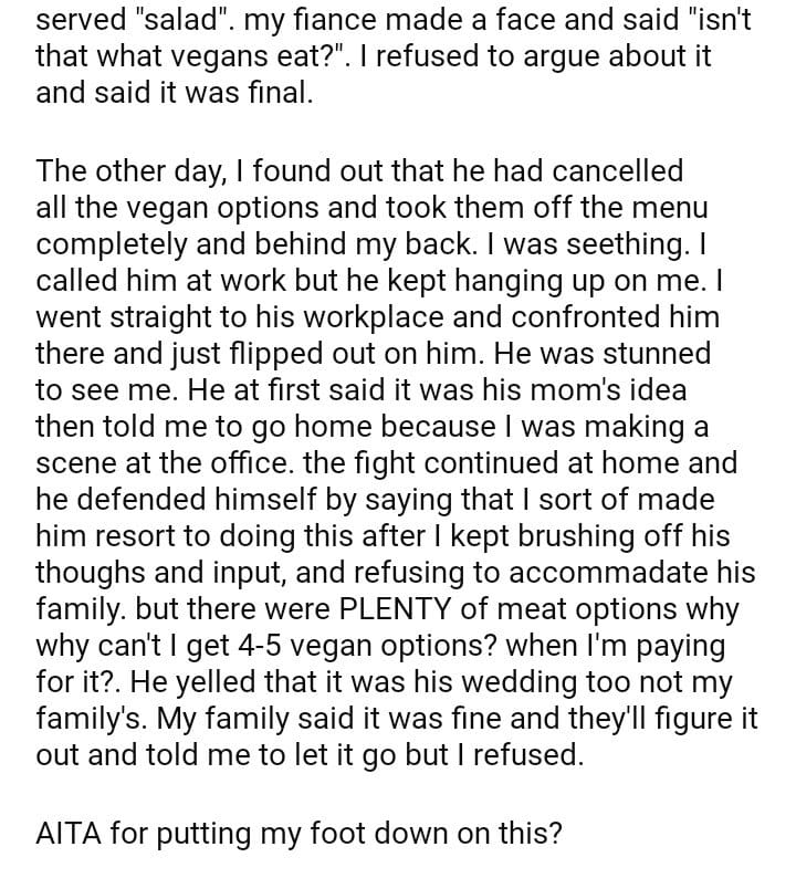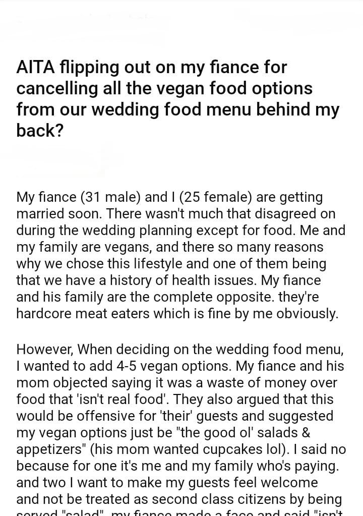 AITA for my fiance for cancelling all the vegan food options