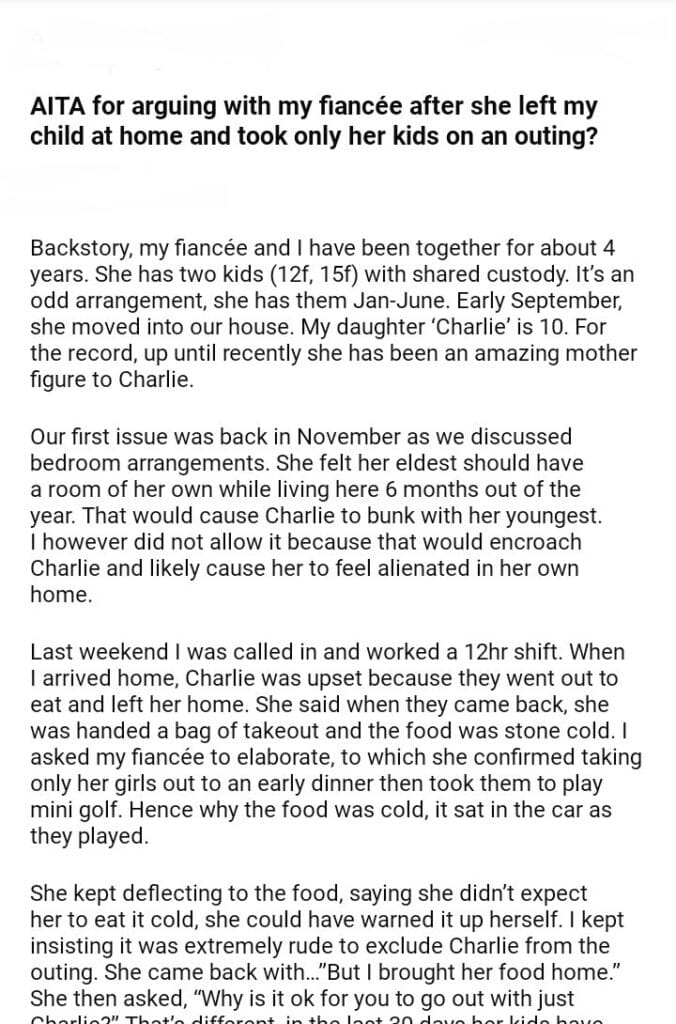 AITA for my fiancée after she left my child at home and took only her kids on an outing?