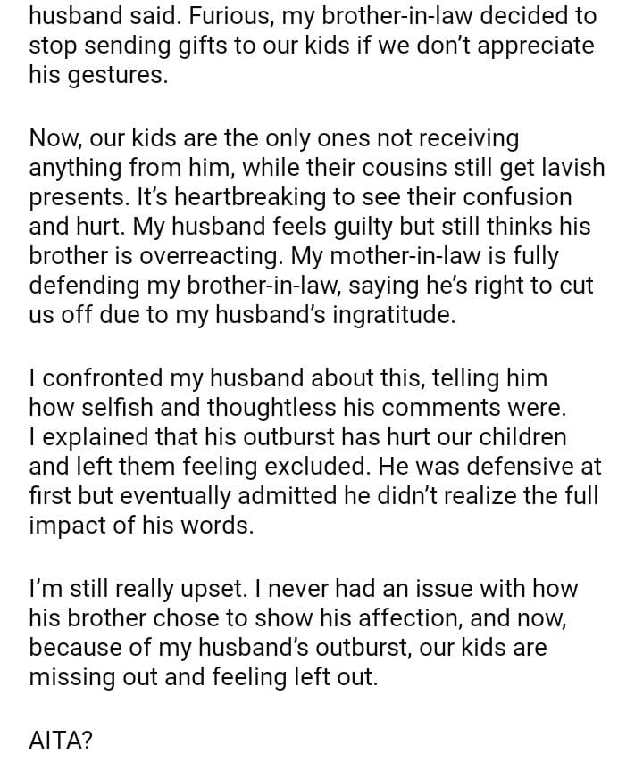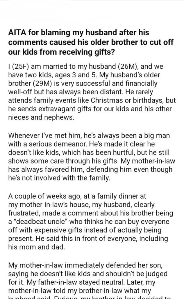 AITA For My Husband After His Older Brother Stop Sending Our Kids gifts