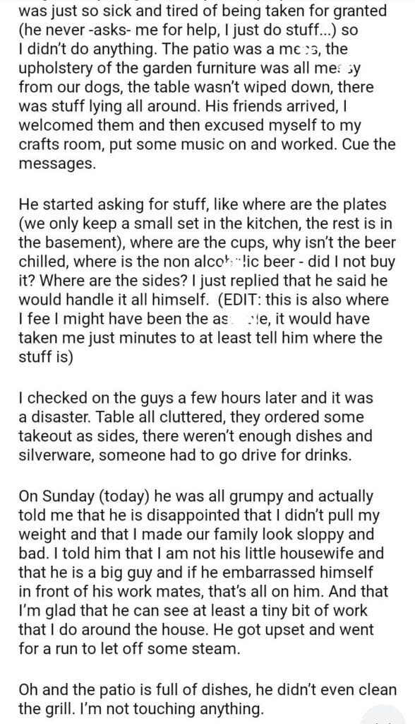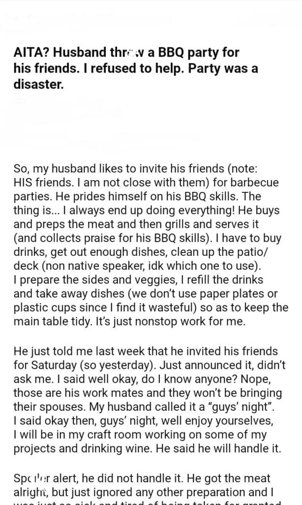 AITA for my Husband BBQ party for his friends