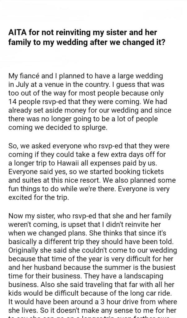 AITA for my sister and her family to my wedding
