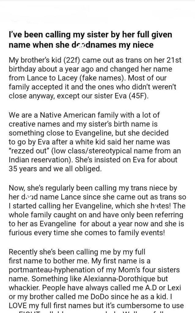 AITA for my sister for my niece name