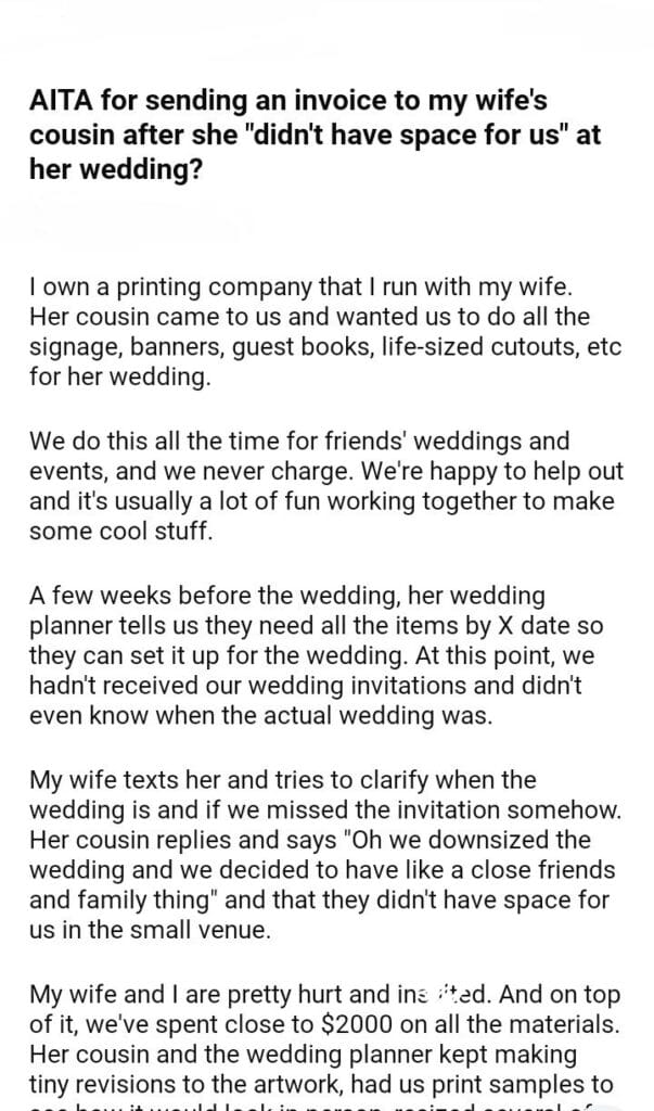 AITA for my wife’s cousin after she “didn’t have space for us”