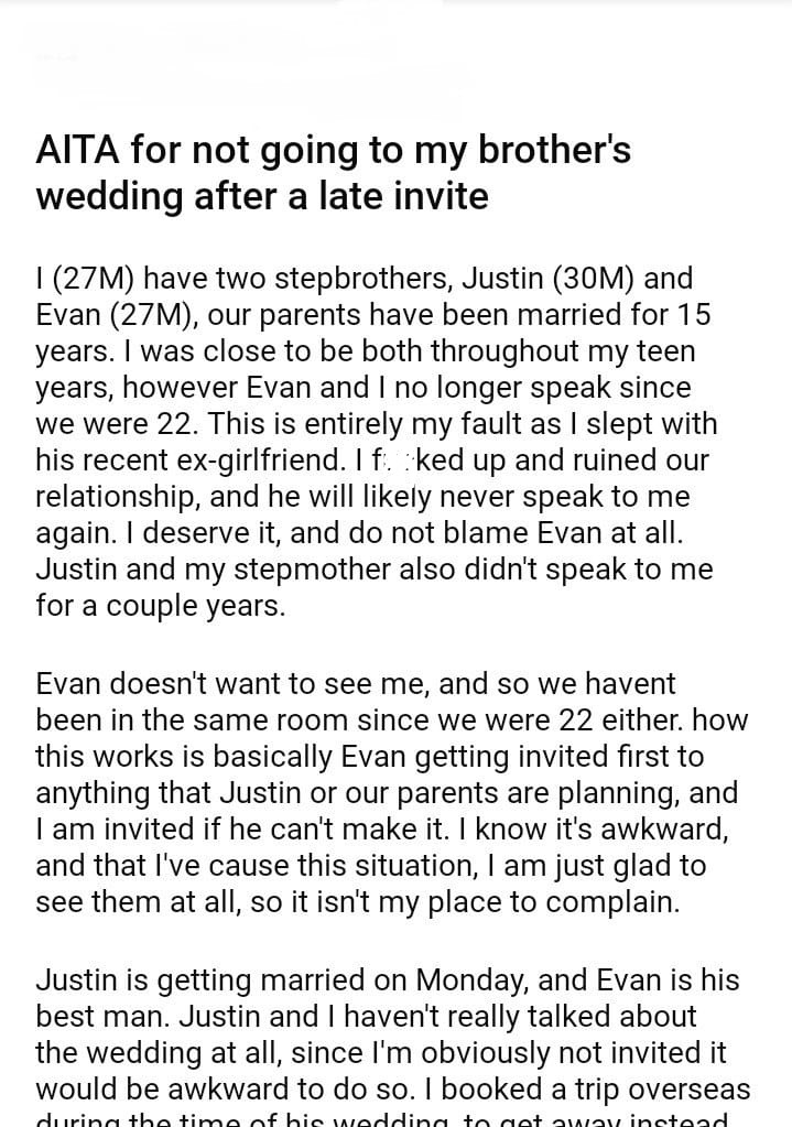 AITA for not going to my brother’s wedding after a late invite