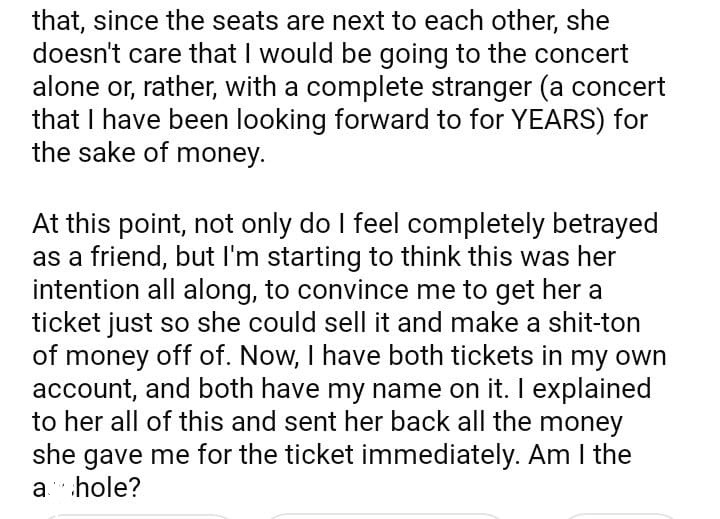 AITA for not letting a friend sell her concert ticket?