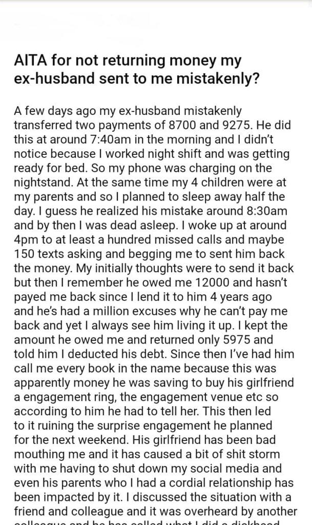 AITA for not returning money my ex-husband sent to me mistakenly?