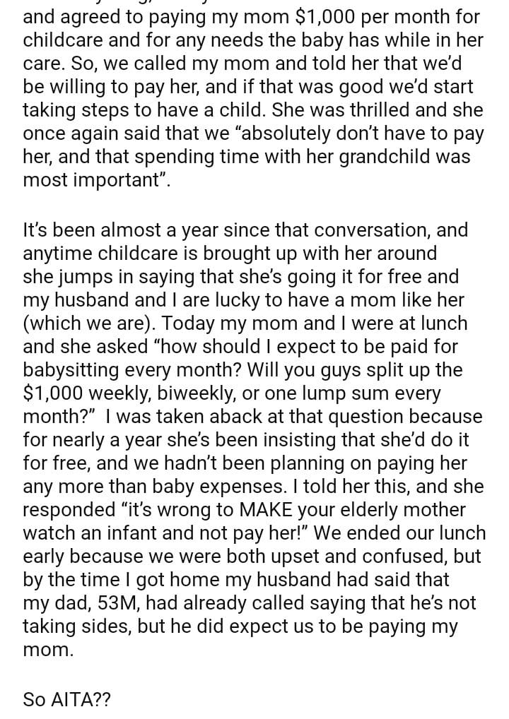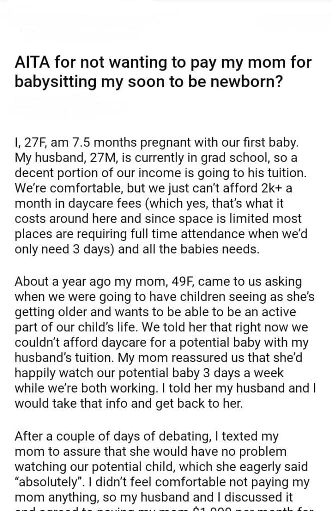 AITA for not wanting to pay my mom for babysitting my soon to be newborn?