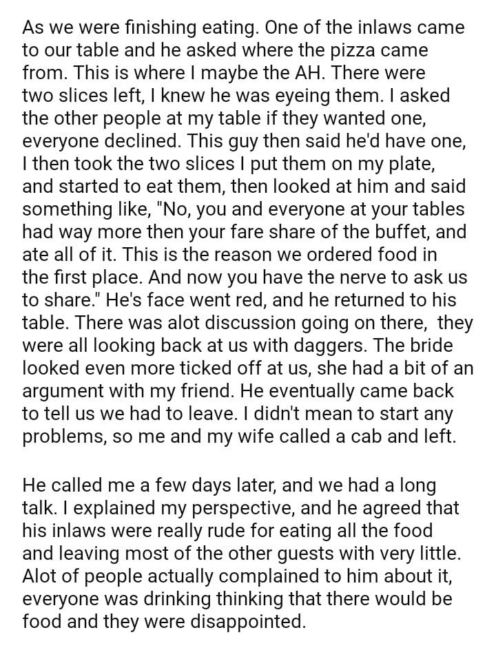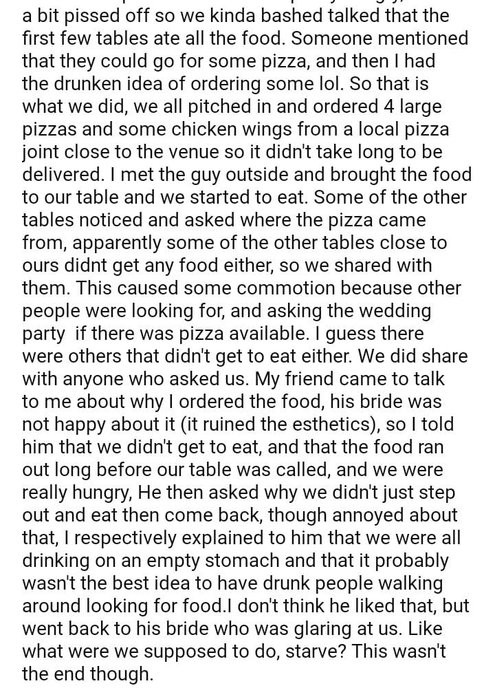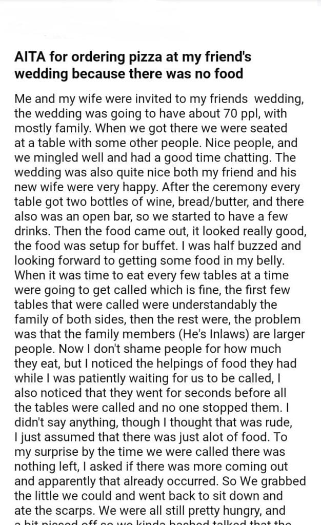 AITA for ordering pizza at my friend’s wedding because there was no food