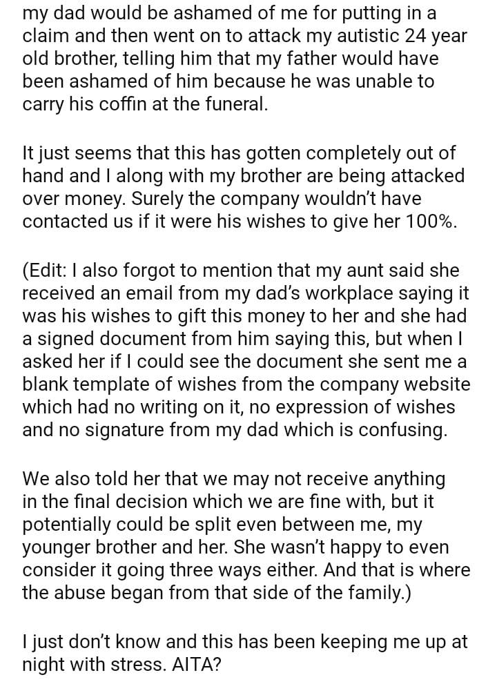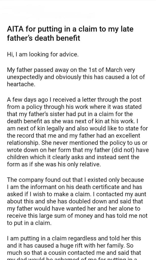 AITA for putting in a claim to my late father’s benefit