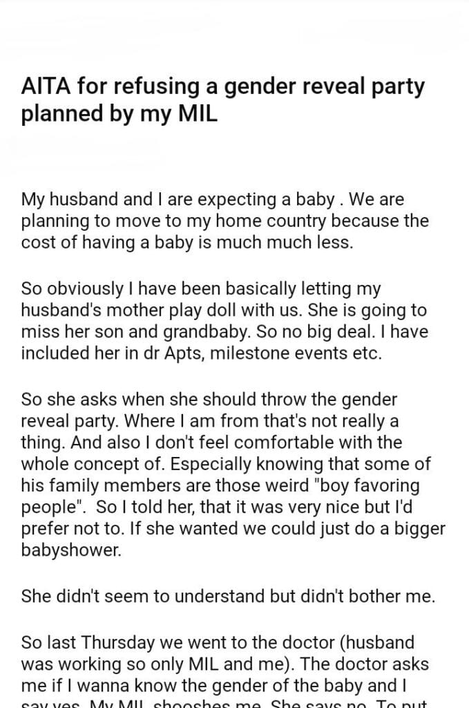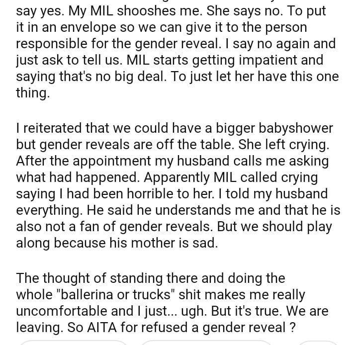 AITA for refusing a gender reveal party planned by my MIL