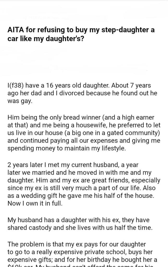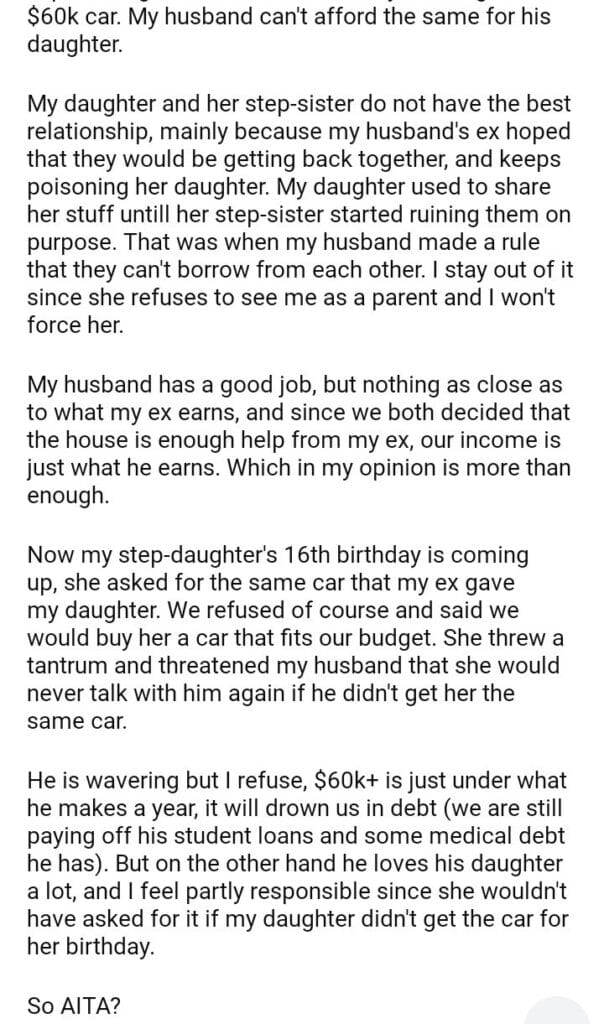 AITA for refusing to buy my step-daughter a car like my daughter’s?