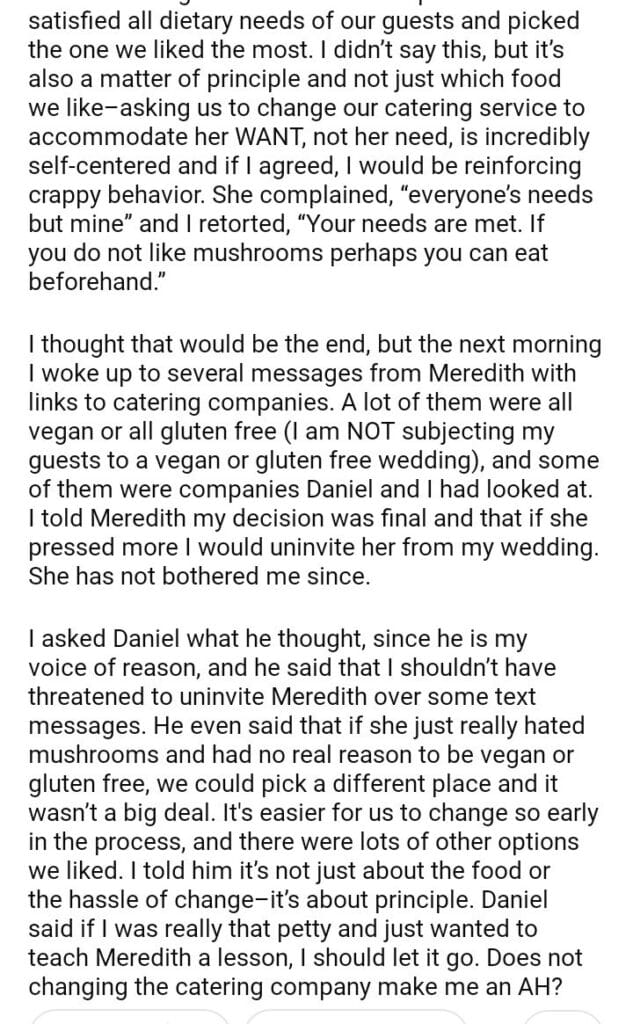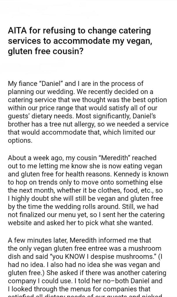 AITA for refusing to change catering services to accommodate my vegan, gluten free cousin?