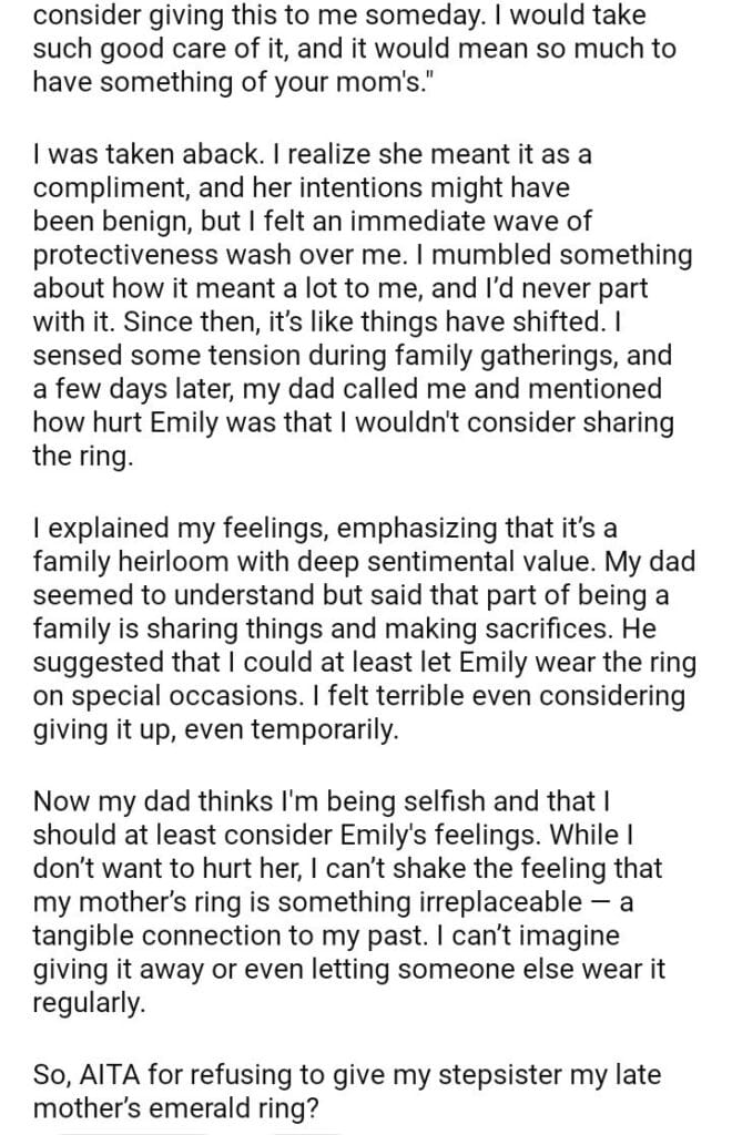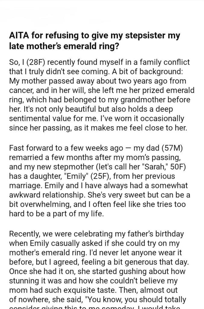 AITA For Refusing To Give My Stepsister My Mother’s Ring