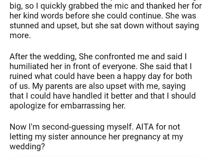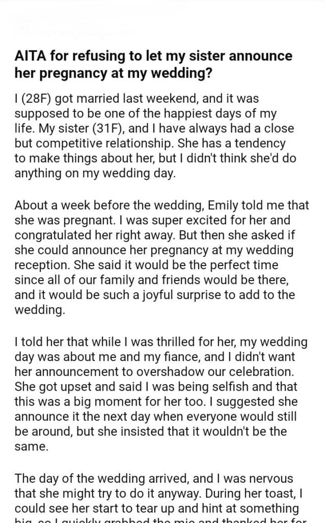 AITA for refusing to let my sister announce her pregnancy at my wedding
