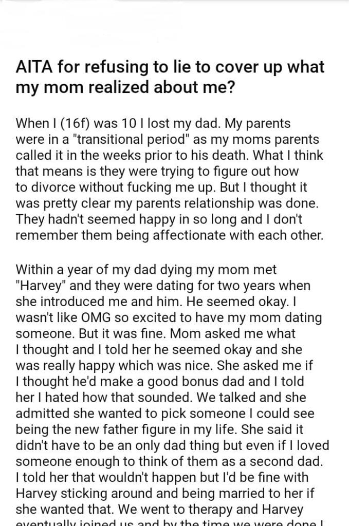 AITA for refusing to lie to cover up what my mom realized about me?