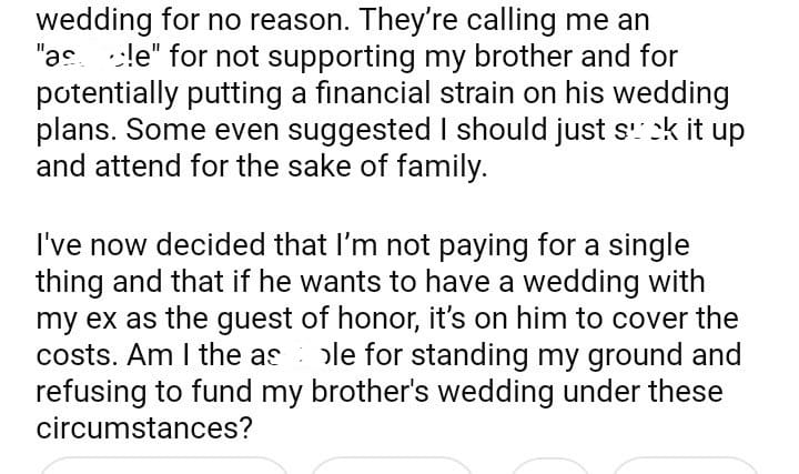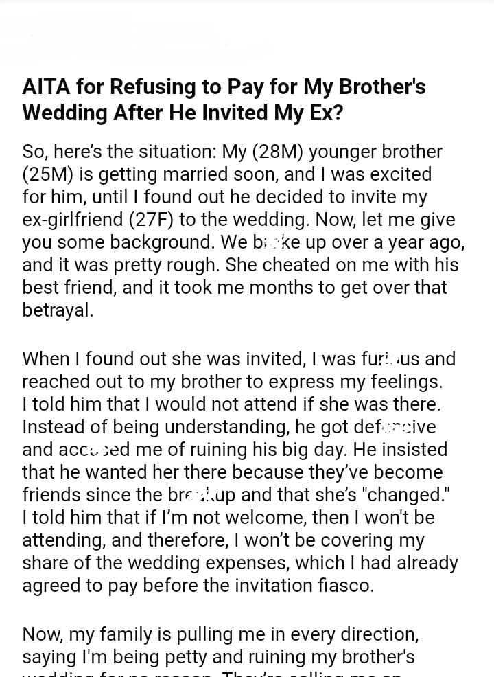 AITA for Refusing to Pay for My Brother’s Wedding After He Invited My Ex?