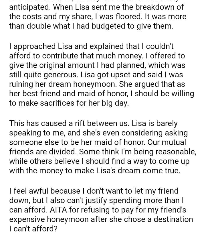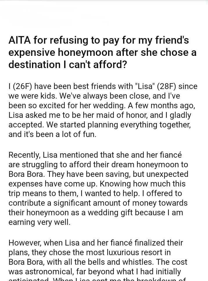 AITA for refusing to pay for my friend’s expensive honeymoon