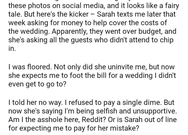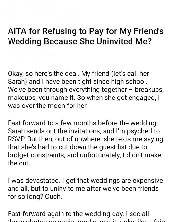 AITA for Refusing to Pay for My Friend’s Wedding Because She Uninvited Me?