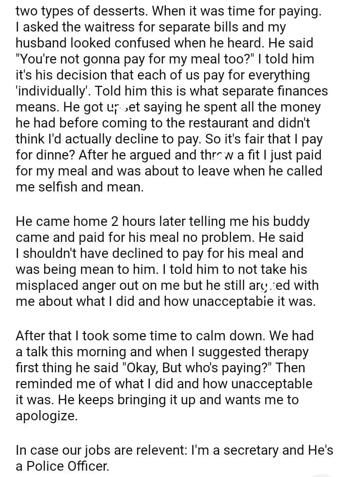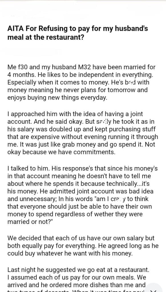 AITA For Refusing to pay for my husband’s meal