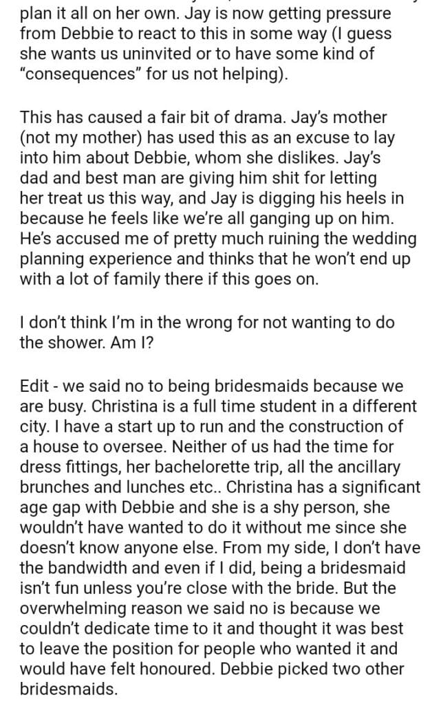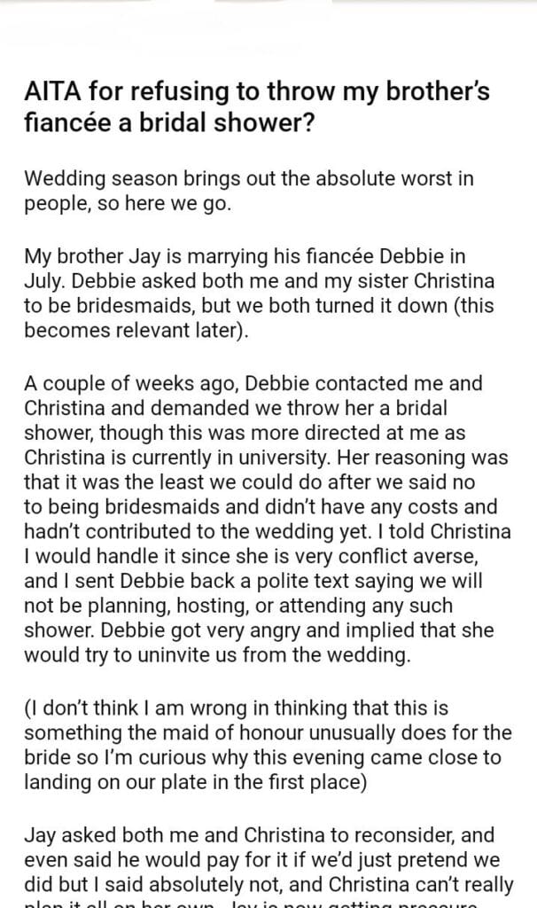 AITA for refusing to throw my brother’s fiancée a bridal shower?