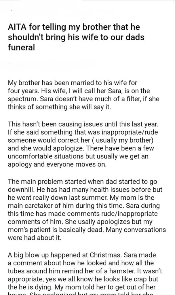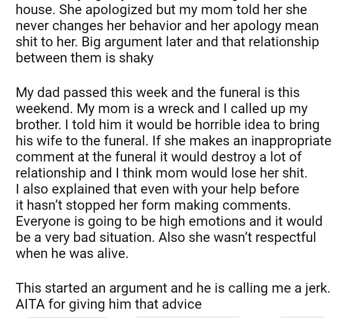 AITA for telling my brother that he shouldn’t bring his wife to our dads funeral
