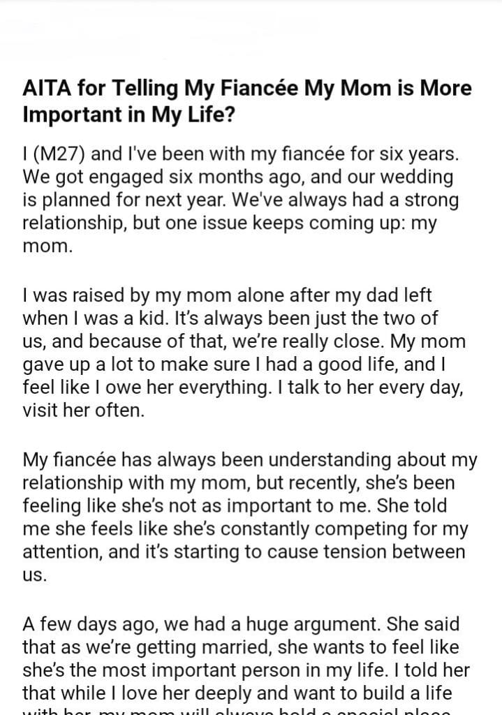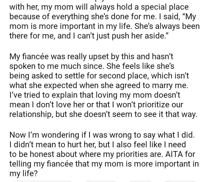 AITA for Telling My Fiancée My Mom is More Important
