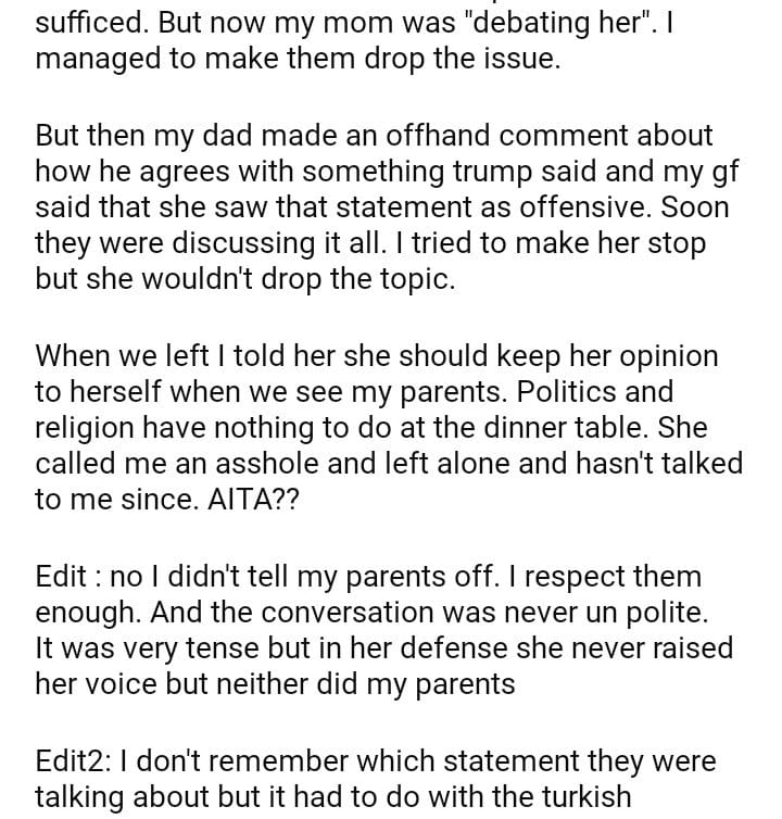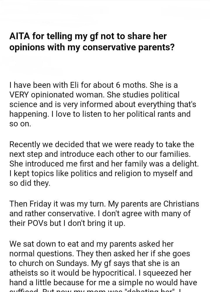 AITA for telling my gf not to share her opinions with my parents?