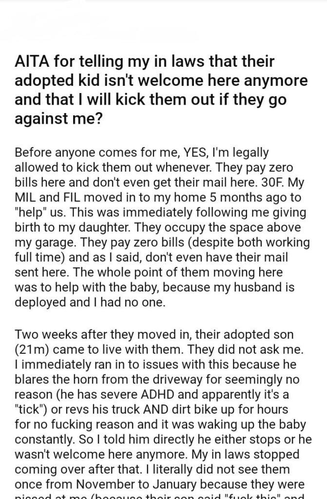 AITA for telling my in laws that their adopted kid isn’t welcome here anymore