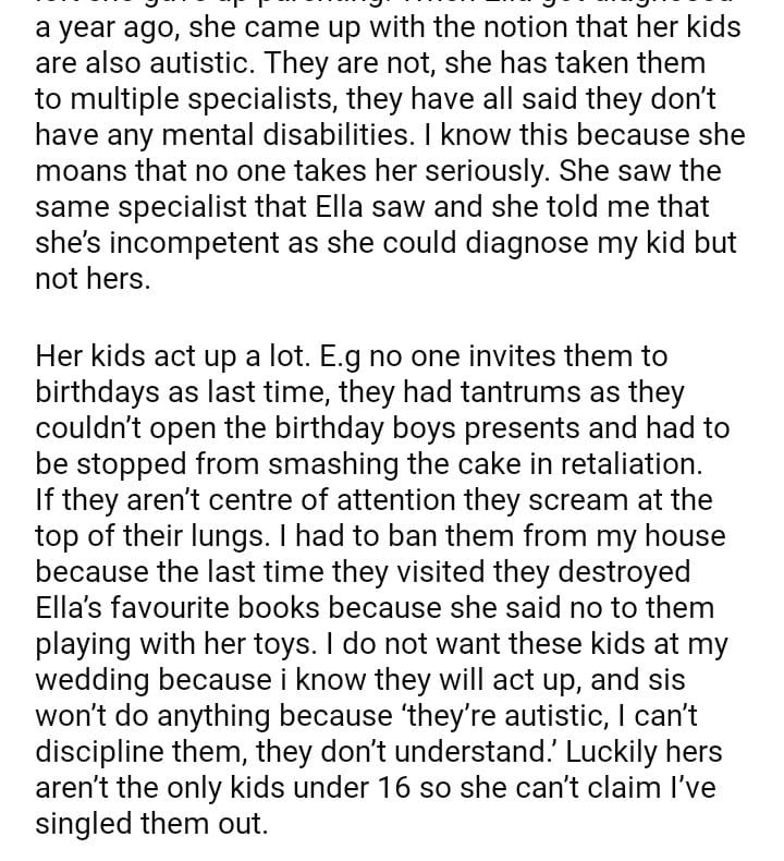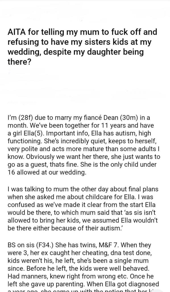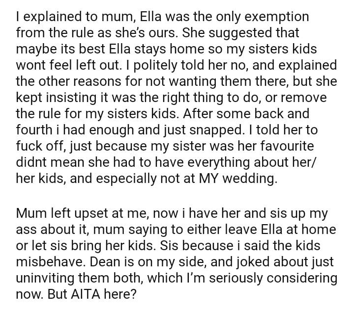 AITA for telling my mum and refusing to have my sisters kids at my wedding?