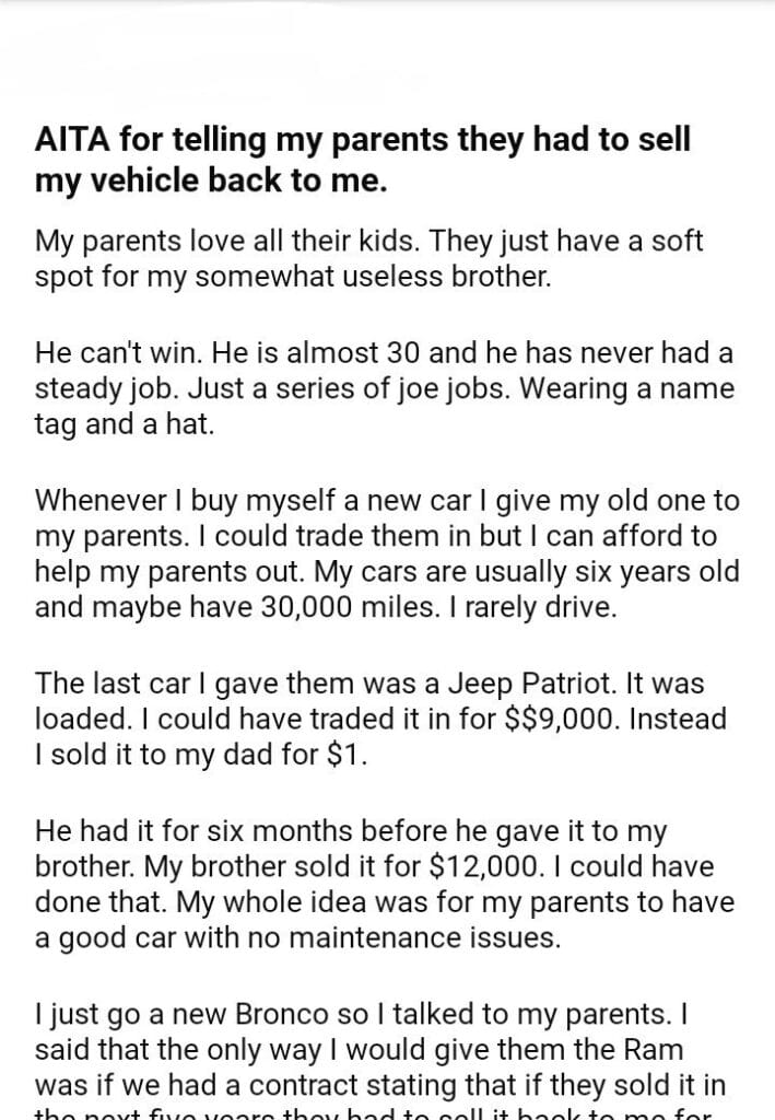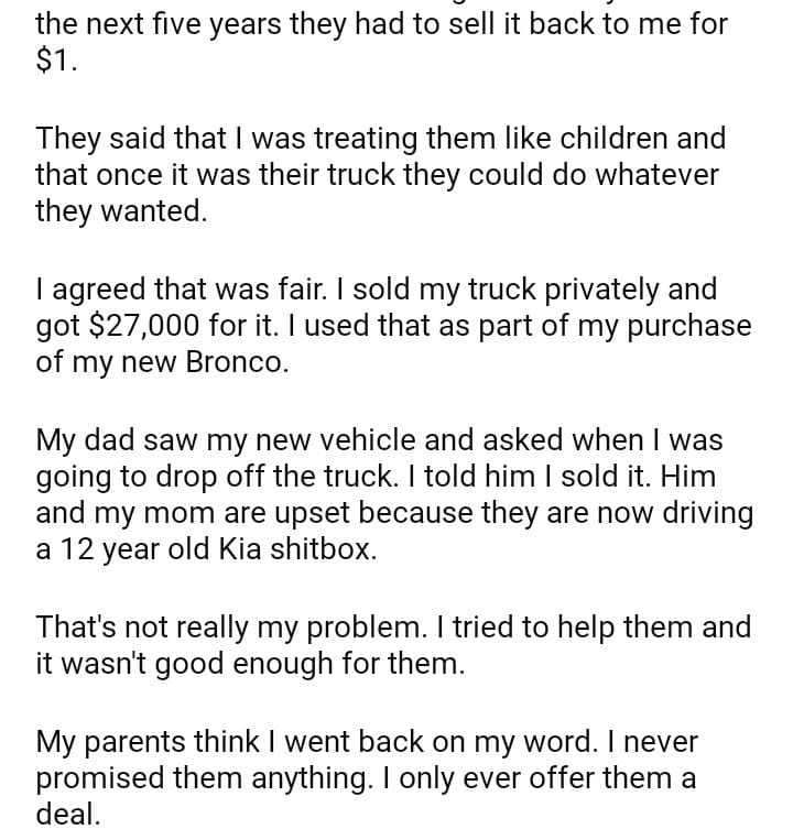 AITA for telling my parents they had to sell my vehicle back to me.