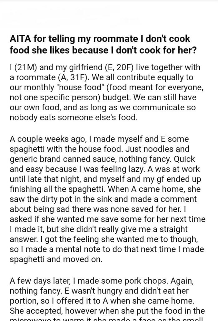 AITA for telling my roommate I don’t cook food she likes because I don’t cook for her?