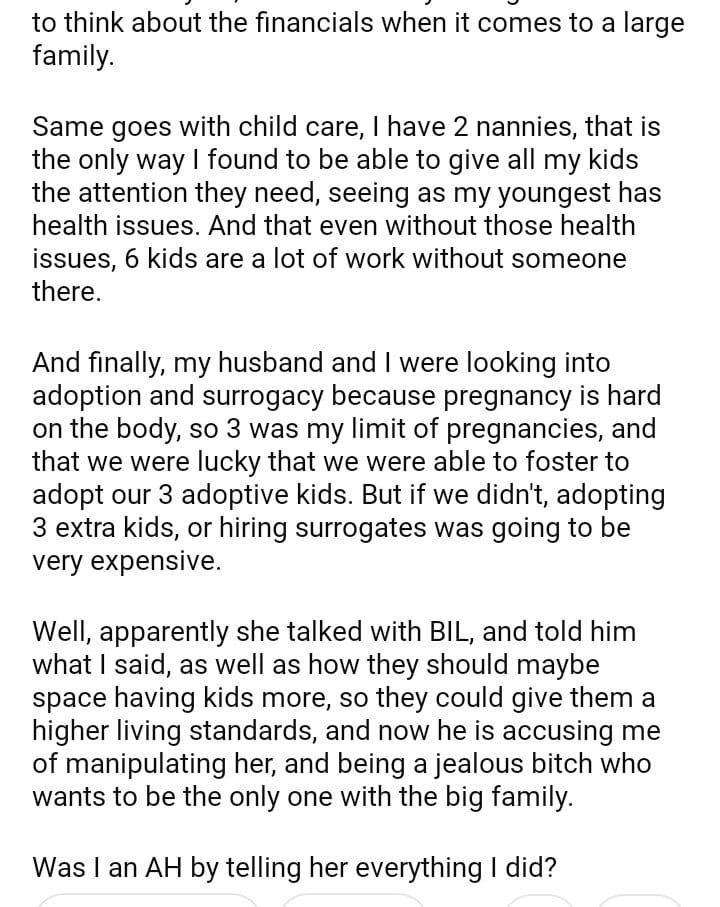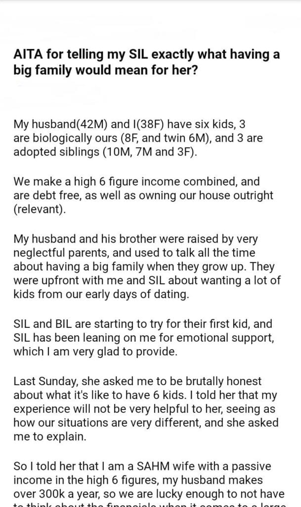 AITA for telling my SIL exactly what having a big family would mean for her?