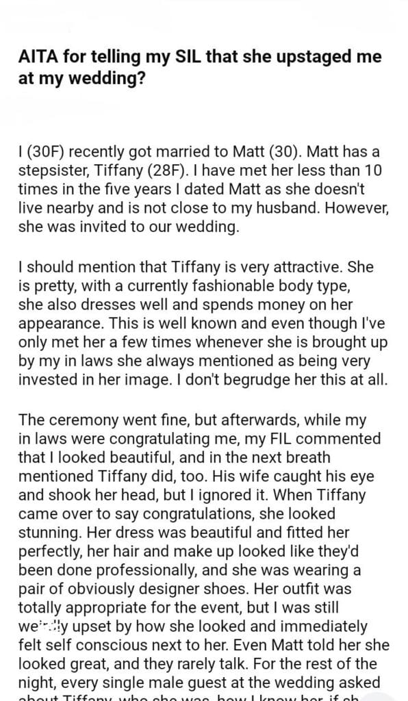 AITA for telling my SIL that she upstaged me at my wedding?