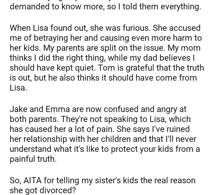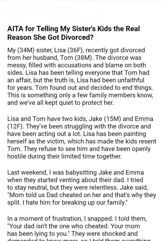 AITA for Telling My Sister’s Kids the Real Reason She Got Divorced?